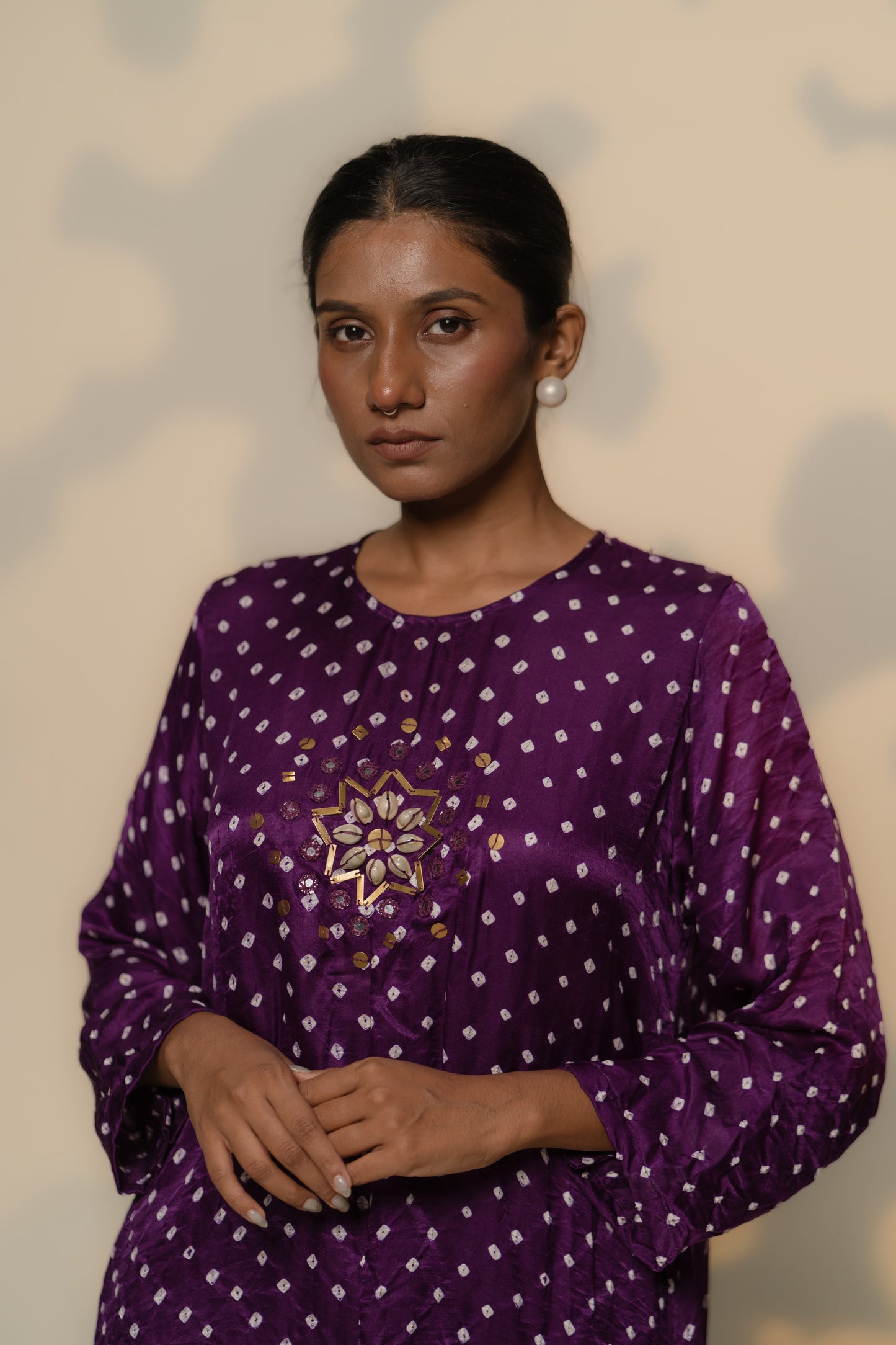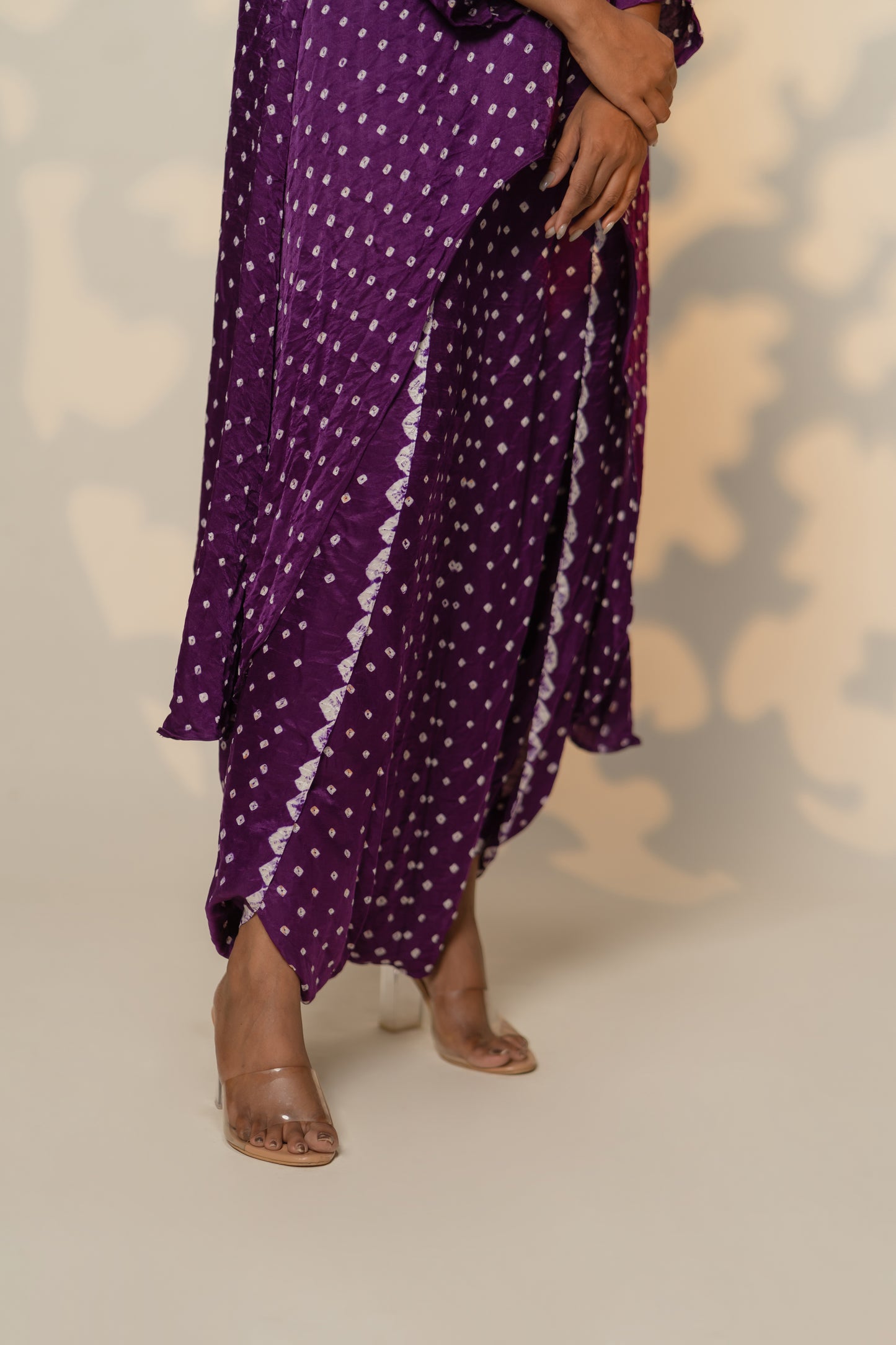 Long Back and Short Front Kurta with embroidred motif. Paired with an Overlap Dhoti Skirt