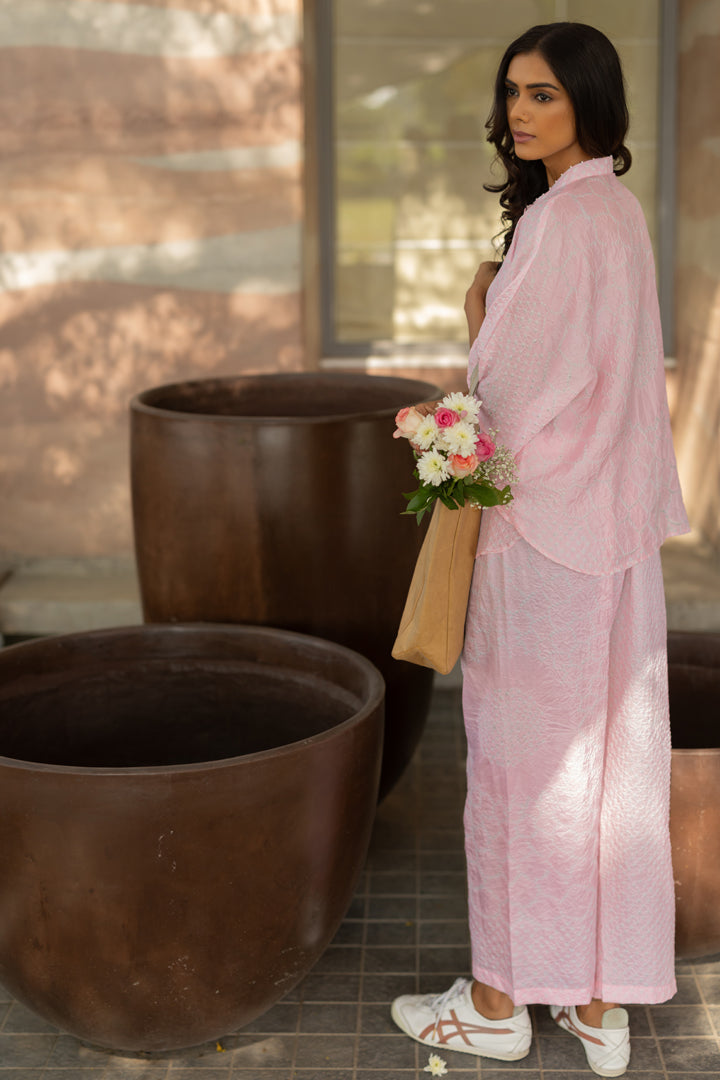 Bandhani free size Kaftan style short shirt with a flower motif at the back