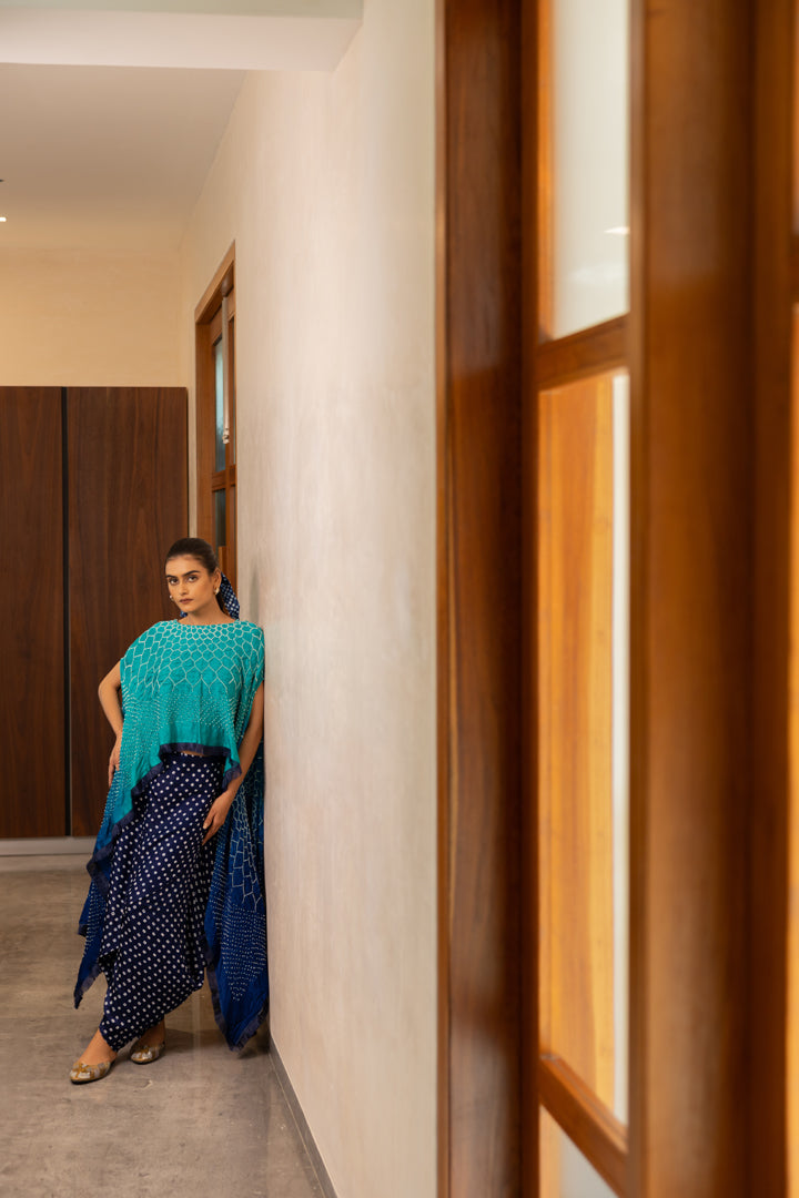 Bandhani Cape with a fringe border. Best teamed with the Wrap Dhoti.