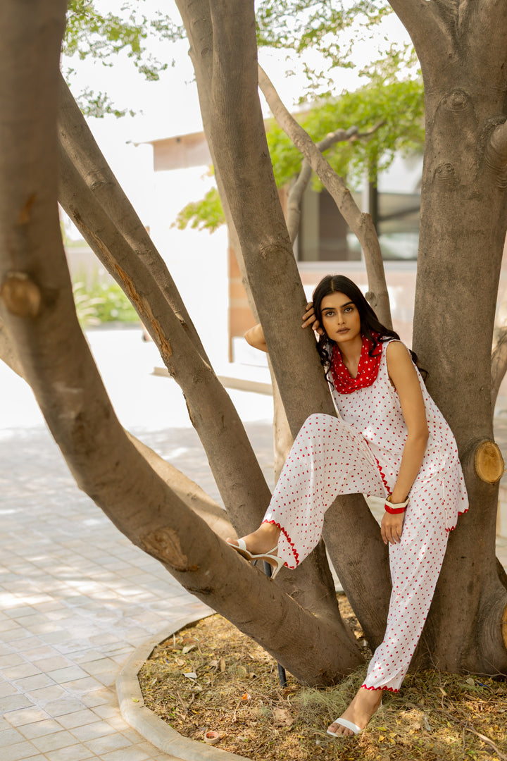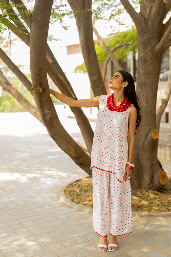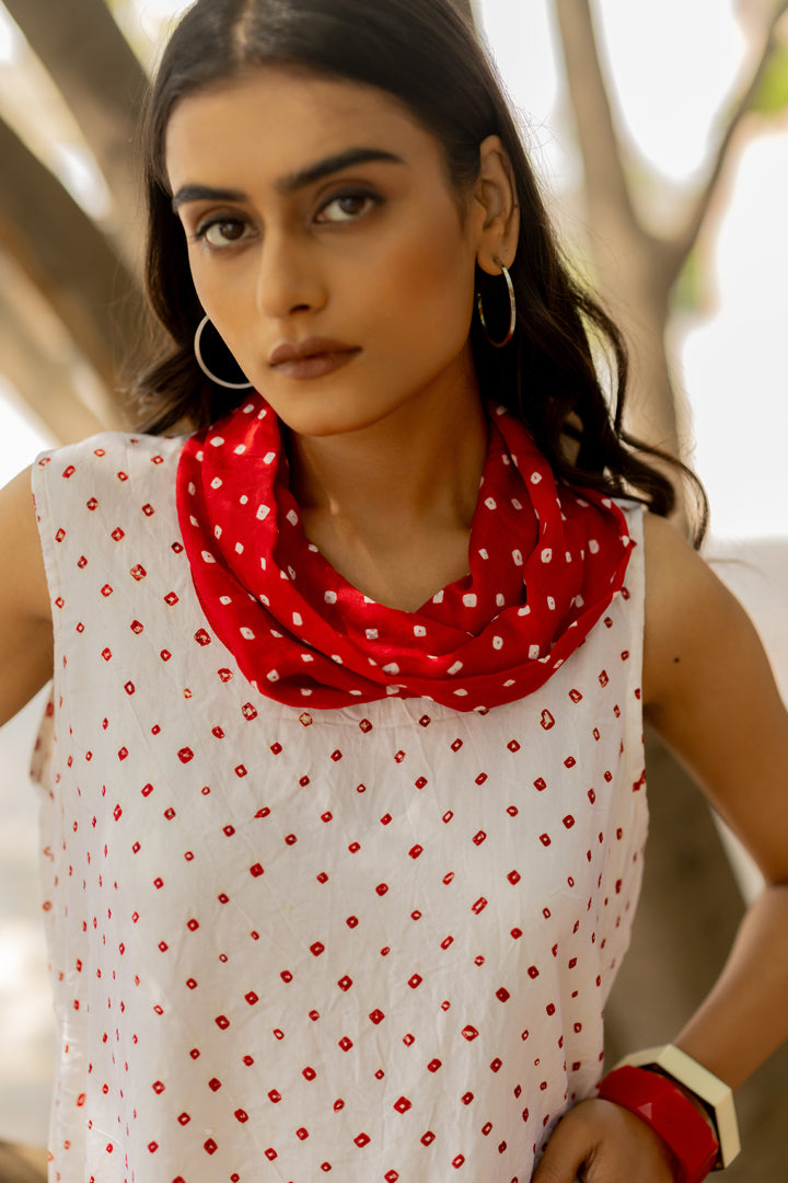Sleeveless top with contrast cowl. Paired with straight pants.