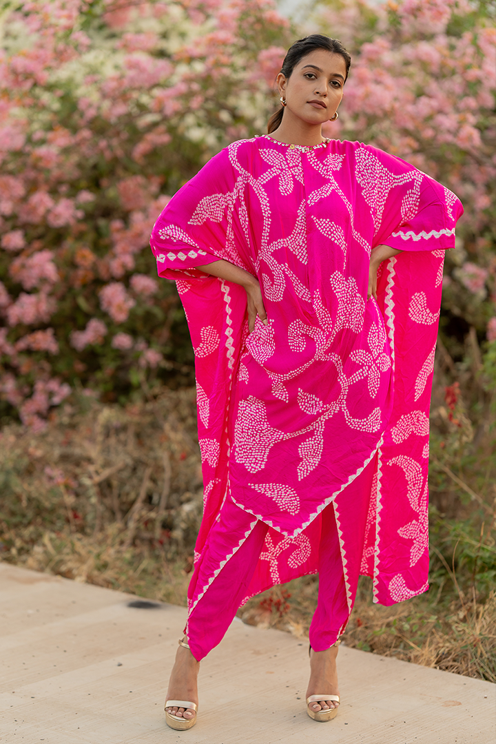 Asymmetrical Kurta with Button details on the neck. Paired with overlap dhoti pants